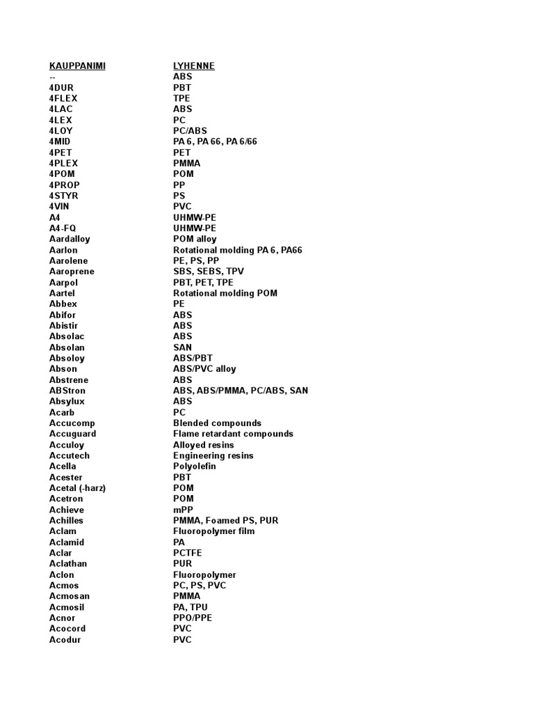 Plastic Trade Name Listings From A To Z Trade Name Listings