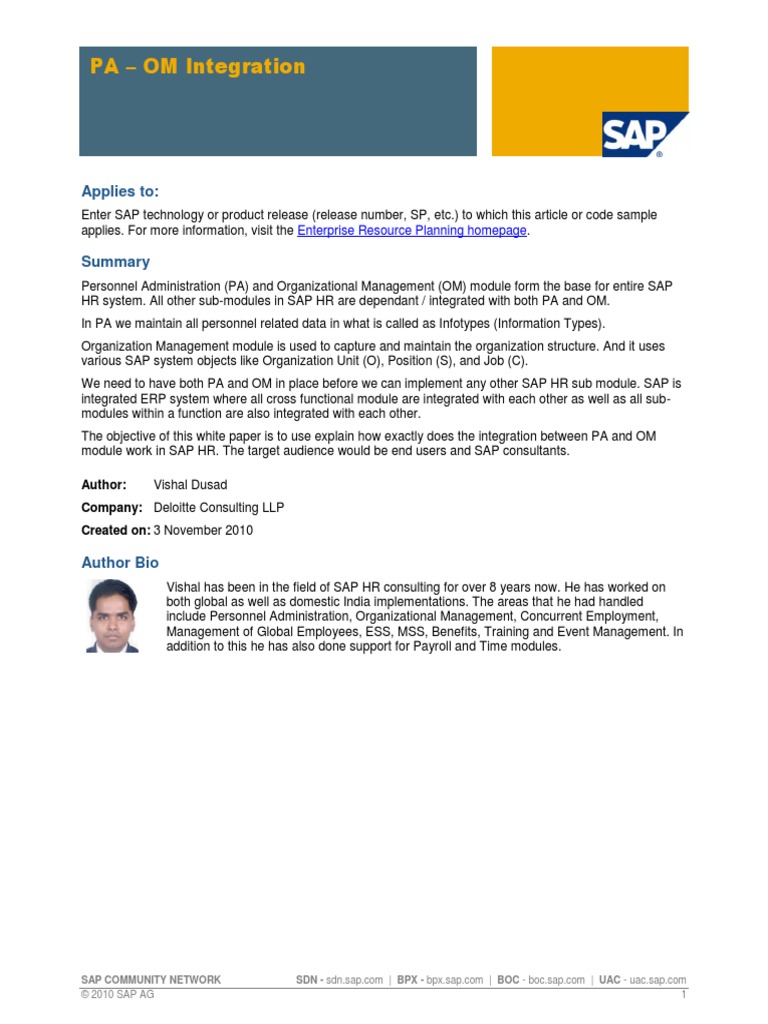 Ability to analyze requests define functional solution and estimate effort in sap paom module good sap technical knowledge dictionary batch input transport organizer job scheduling dynamic actions configuring of hr features and evaluation path ability to coordinate tasks with the team and work on them in autonomy. Broad experience in functional configuration of pa om pd tm payroll benefits sub modules of sap hrhcr with exclusive experience in tm bn py sub modules. Expertise in integration of various payroll sub modules such as pa om tm py bn py etc. Configuration testing rollout and post implementation support.